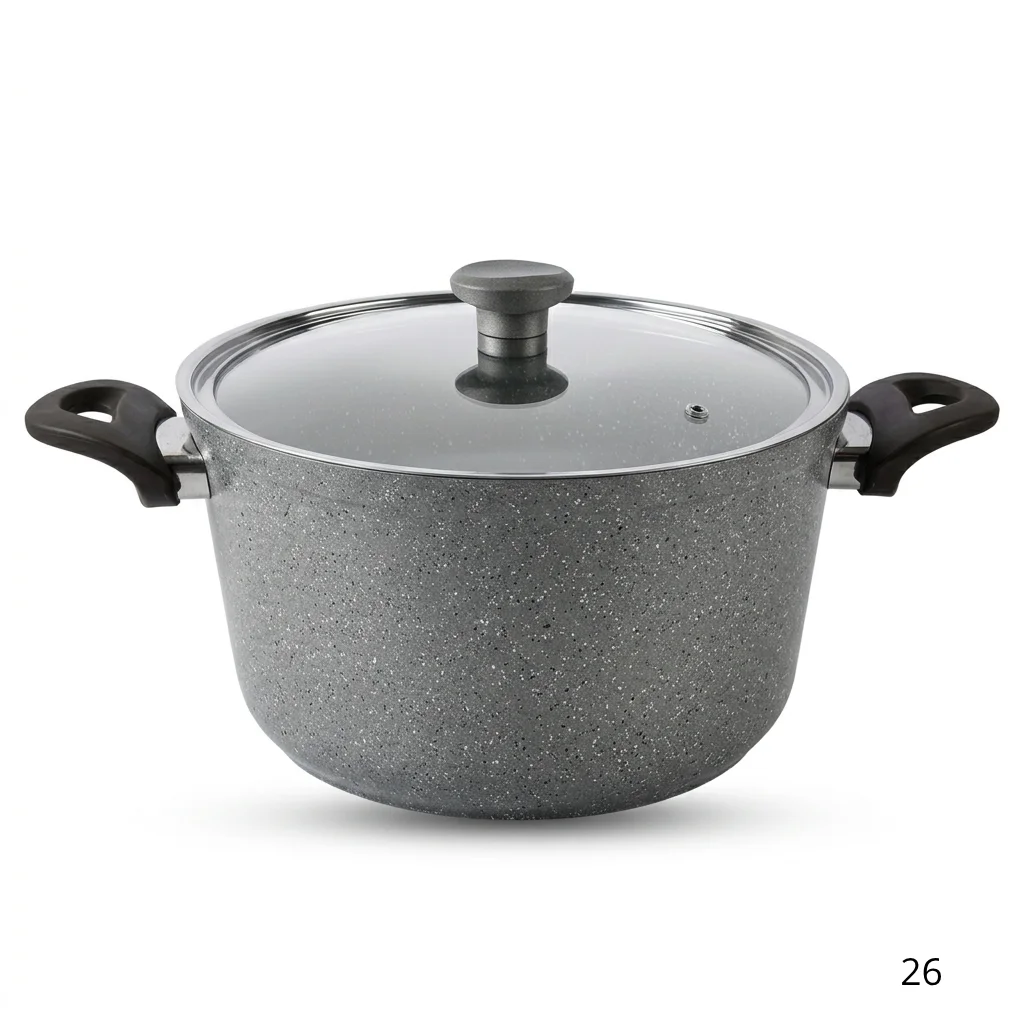 حلة طهى توب شيف جرانيت مقاس 26 سم مناسبة جداً للعيلة، تقدر تستخدمها في الخضار، الشوربة أو الأكلات التقيلة، ومع خامة الجرانيت مش هتعاني من الأكل اللي بيلزق أو بيتحرق.