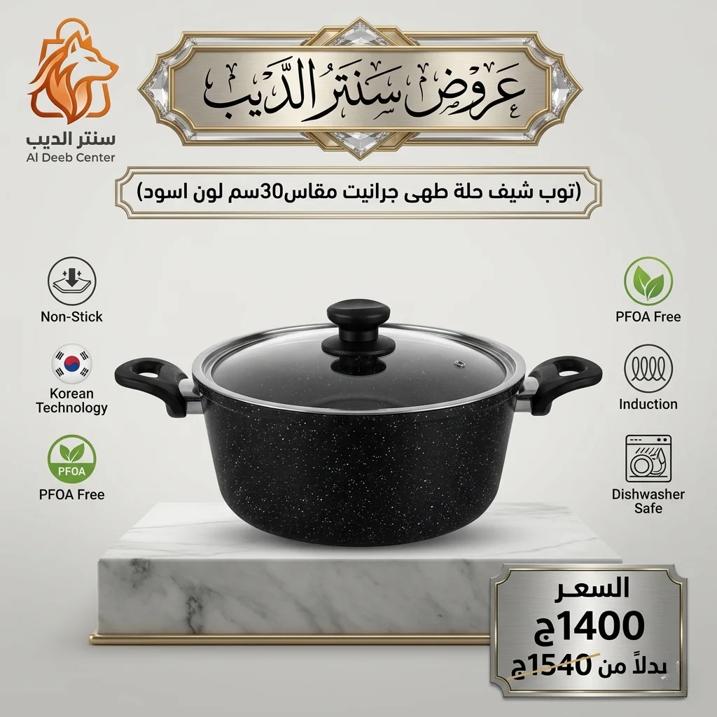 حلة طهى توب شيف جرانيت مقاس 30 سم مناسبة جداً للكميات الكبيرة، تقدر تعتمد عليها في كل الأكلات التقيلة زي المحاشي والشوربة وغيرها، ومع خامة الجرانيت مش هتعاني من الأكل اللي بيلزق أو بيتحرق.
