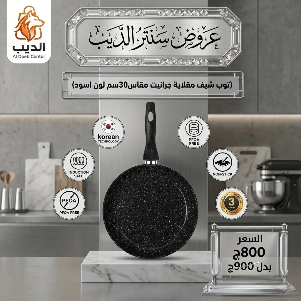 مقلاية توب شيف جرانيت مقاس 30 سم مناسبة جداً للكميات الكبيرة زي الفراخ، البطاطس أو أي أكلة محتاجة مساحة وتسوية مظبوطة، ومع خامة الجرانيت مش هتعاني من الأكل اللي بيلزق أو بيتحرق.